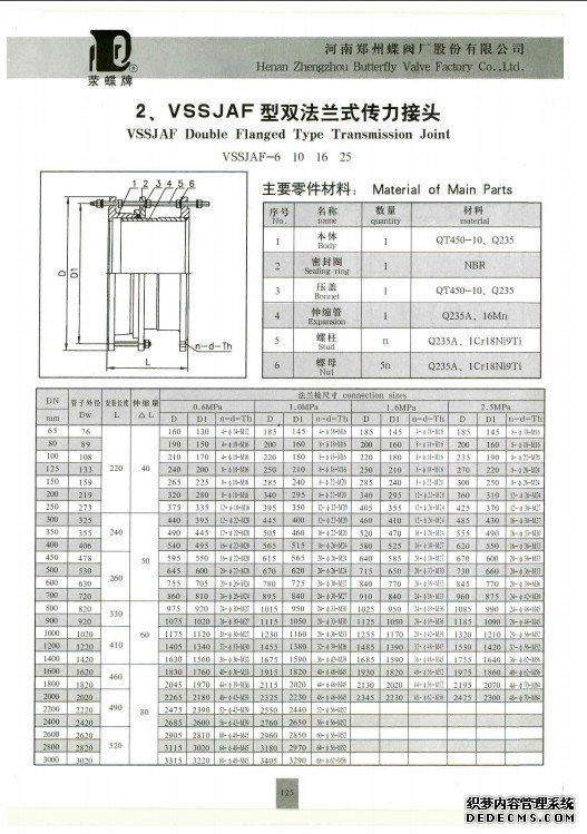 傳力接頭具體分類:按外形分為:VSSJAFG(CF)型單法蘭傳力接頭,VSSJAFG(CF)型單法蘭松套傳力接頭,VSSJAF(C2F)型雙法蘭傳力接頭,VSSJAF(C2F)型雙法蘭松套傳力接頭, VSSJAGC(CC2F)型可拆式雙法蘭松套傳力接頭。按型號(hào)分為:雙法蘭傳力接頭的型號(hào)有VSSJAF型、VSSJAFC型、VSSJA-2型、C2F型、VSSJAFG 型等等。